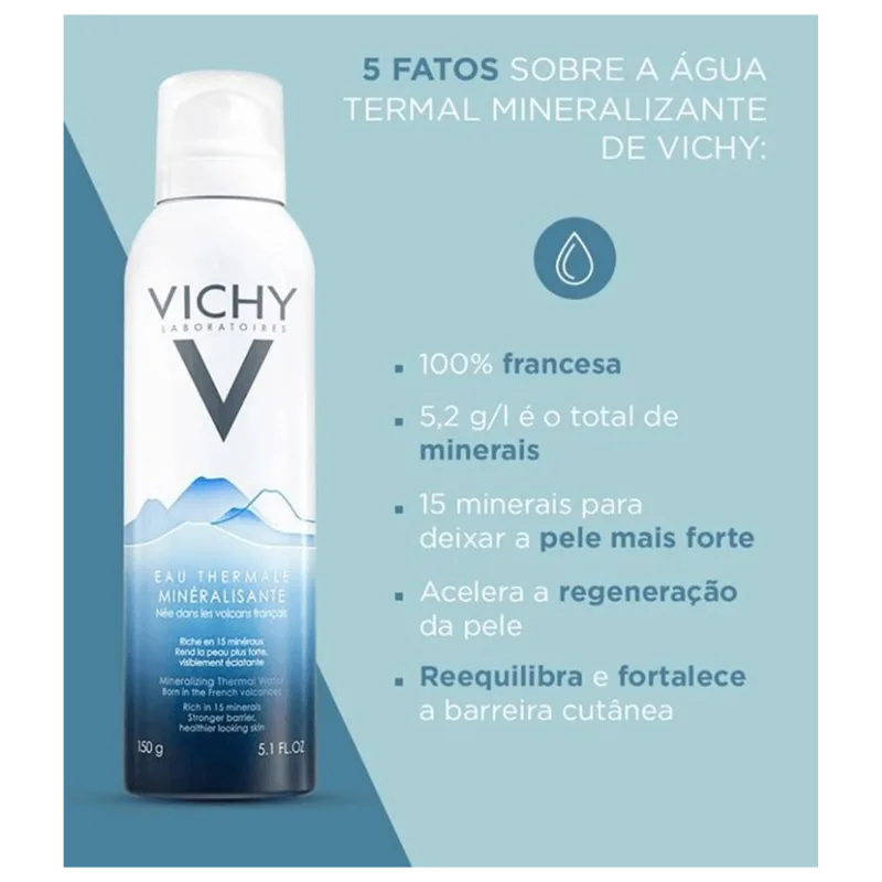 Vichy Eau Thermale Minéralisante deixa a pele com aparência mais saudável e brilhante, pois é enriquecida com 15 minerais raros. É hipoalergênica, previne o envelhecimento precoce, ajuda manter a umidade na pele e a proteger contra agressores externos.