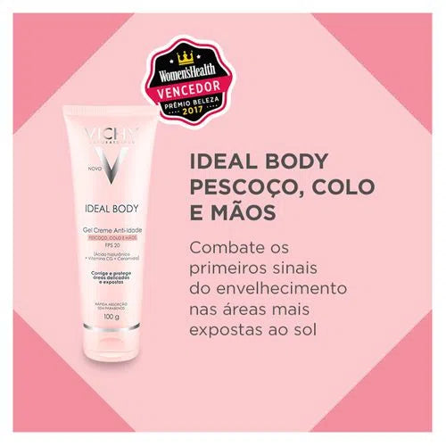 Ideal Body Pescoço, Colo e Mãos FPS 20 de Vichy foi desenvolvido especificamente para as três regiões do corpo que são mais expostas ao sol, e que primeiro evidenciam os sinais do envelhecimento, com objetivo específico de proteger, hidratar por 24h, prevenir o envelhecimento precoce e manter a luminosidade da pele.
