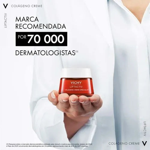 O Vichy Liftactiv Colágeno Creme Specialist apresenta uma nova fórmula que associa a Água Vulcânica Vichy a um concentrado de ativos dermatológicos para resultados clinicamente comprovados a partir de uma aplicação contínua.