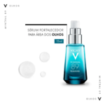 O Gel Sérum Vichy Minéral 89 Olhos traz fórmula que combina o complexo fortalecedor da fórmula do Minéral 89 (89% de Água Vulcânica de Vichy + Ácido Hialurônico) a ativos específicos para a área dos olhos (cafeína pura + dermochlorela), para um visual radiante e descansado.